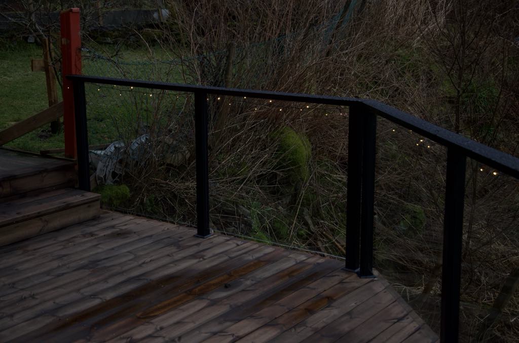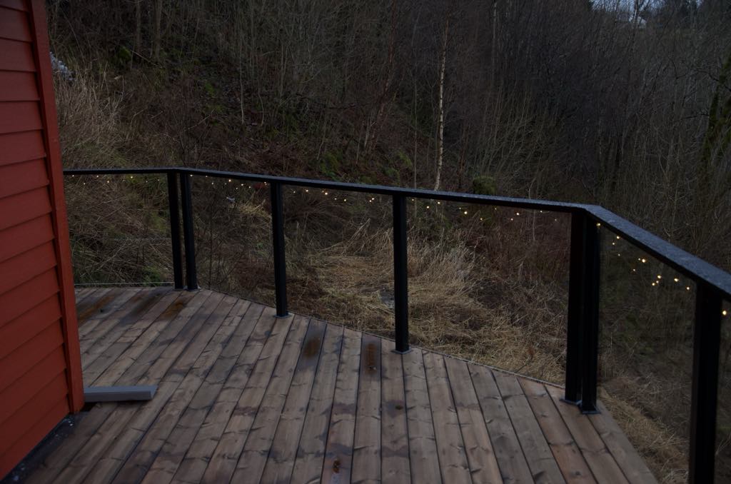 Glassrekkverk til et trehytte-prosjekt. Frontmonterte stolpeprofiler i Sort og klare sikkerhetsglass. Håndløper som avslutning over glassene.